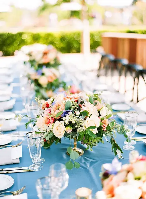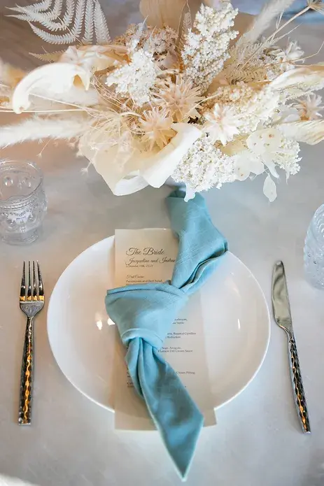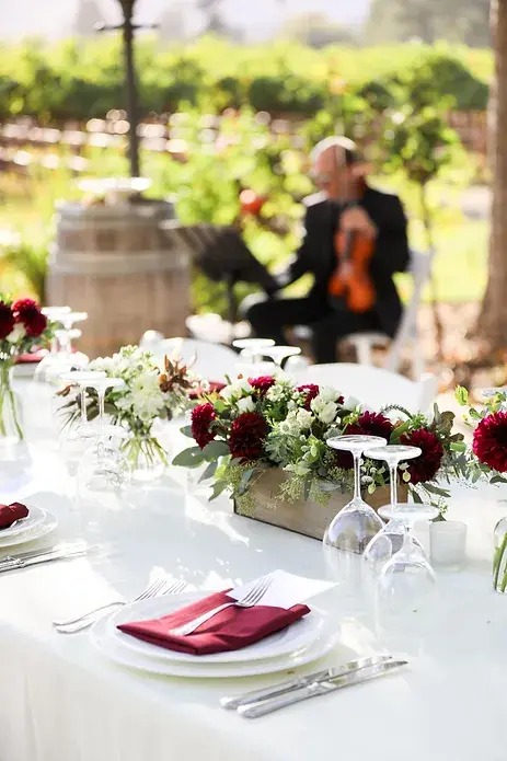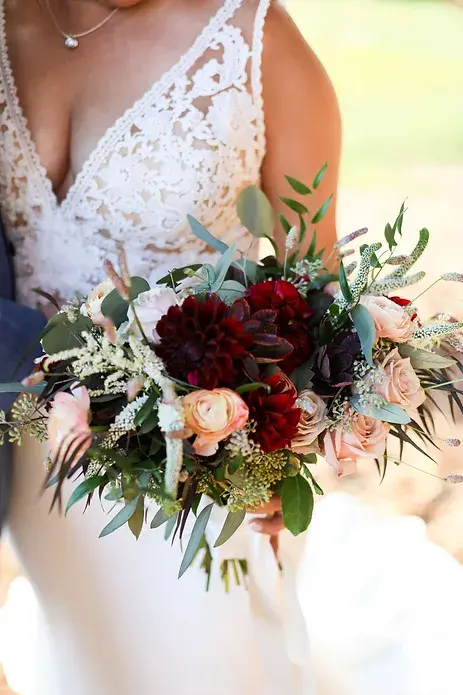 Floral style includes local seasonal blooms and greenery. This style will be showcased in your bouquet(s), boutonnière(s), tablescapes, ceremony floral and cake flowers.